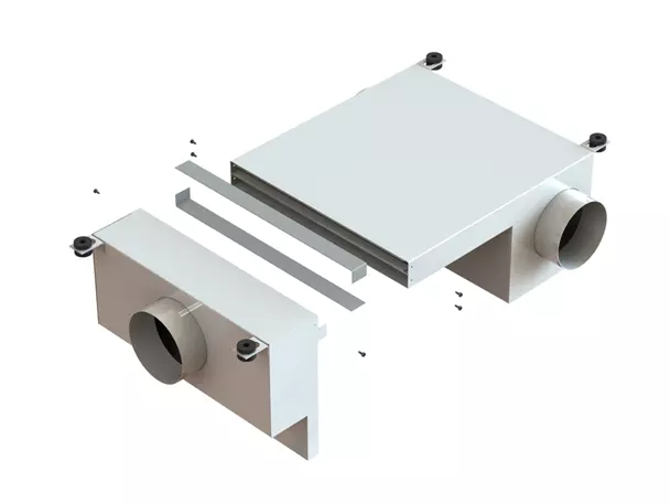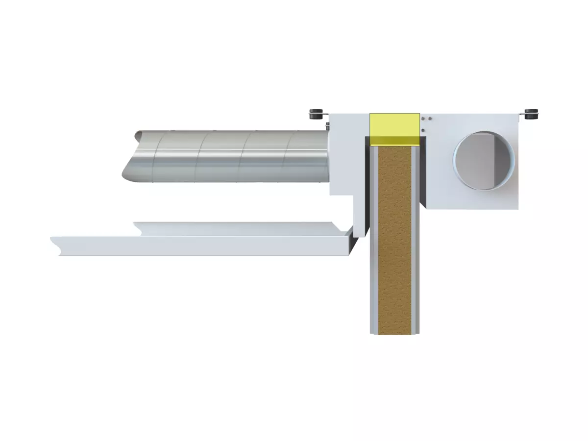 Der Luftanschlusskasten spielt eine entscheidende Rolle bei der effizienten Abluftableitung im Raum, indem er die Abluft an einem optimalen Ort abzieht – nämlich in der Schattenfuge der geschlossenen Decke, die sich bei der flurseitigen Wand befindet. Der raumseitige Zuluft-Anschluss wird dabei geschickt mit einem Luftdurchlass (AQUILO, VENTAMIC) verbunden, wodurch lediglich ein kleiner Wanddurchbruch erforderlich ist.