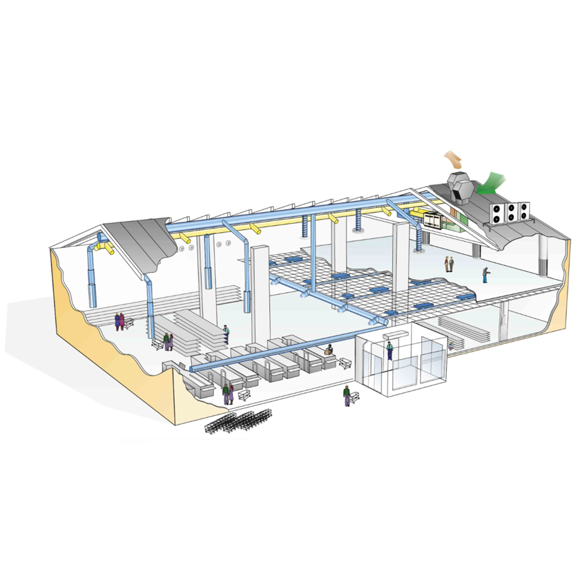 In diesem Einsatzbereich empfehlen sich Lüftungsgeräte, die Lüftung, Heizung und Kühlung kombinieren und eine integrierte Steuerausrüstung haben. Sie sollten mit Umluftklappen versehen sein, um ein energiesparendes, effizientes Heizen in der Nacht und am frühen Morgen zu gewährleisten.