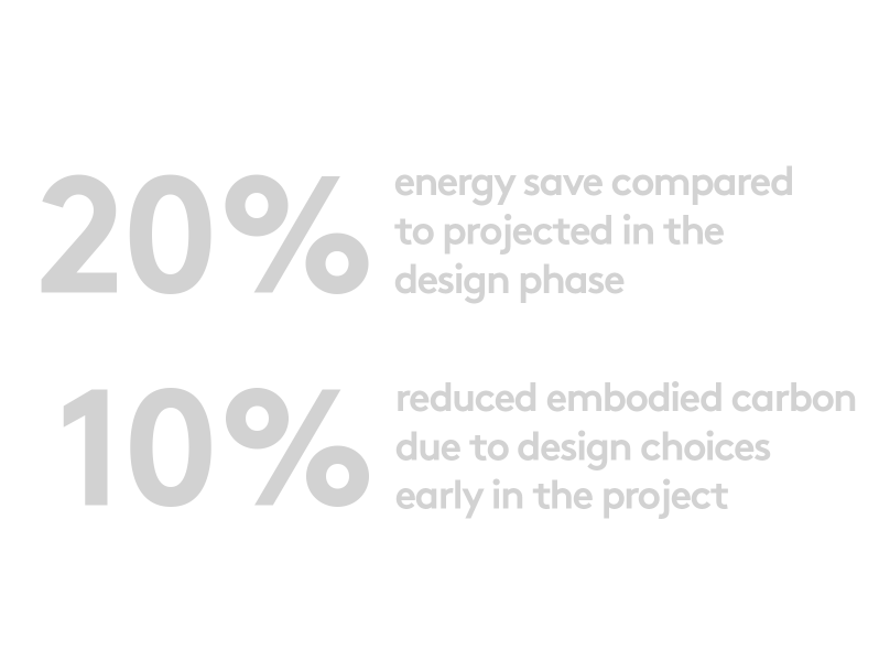 Au‑delà de ces performances énergétiques, cet ensemble de bureaux a également réussi à réduire de 10 % son empreinte carbone incorporée, grâce à des choix de conception intelligents qui ont permis de limiter l’impact environnemental tout en réduisant les coûts globaux.