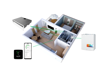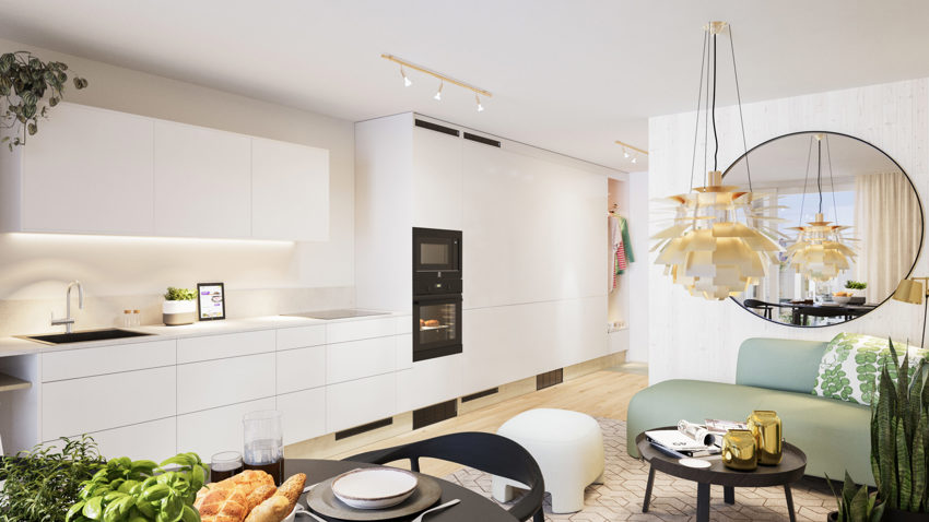Heating and cooling come from one and the same climate solution and are distributed in ducts under cabinets and wardrobes. Each room can feature a target temperature of their own, adjustable from the touch panel or the app. Residents can also set a weekly schedule to minimise energy consumption without compromising the comfortable indoor climate.