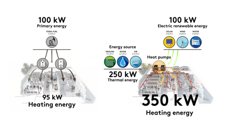 While modern condensing boilers transform 100 kW of Primary energy into 90-95kW of Heating energy, losing 5-10% of Energy, Swegon offers innovative and sustainable solutions that produce over 140kW of Heating Energy by 100kW of primary energy or over 350kW of Heating Energy by 100kW of Electric energy that can be produced by renewable sources.