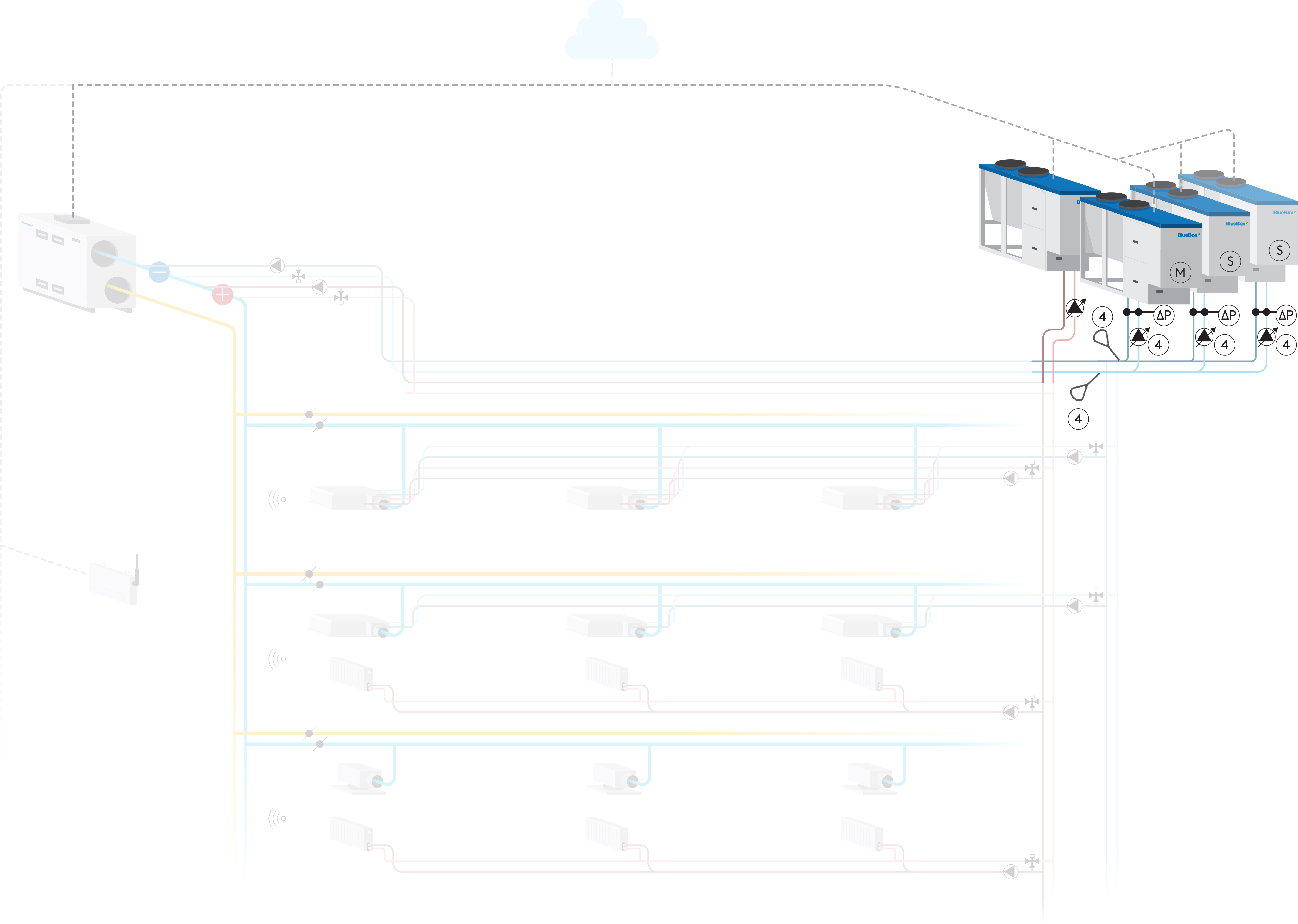 - Master unit is managing the thermoregulation and variable flow by controlling the speed of the pumps of each unit. See Multilogic and Flowzer for more details.