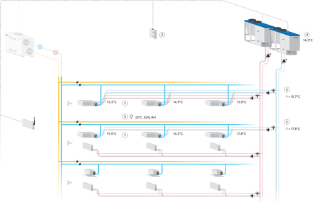 • SuperWISE collects demand temperature from all chilled beams in a group (multiple groups for both heating and cooling can be created in SuWi) and calculates an average need for each group