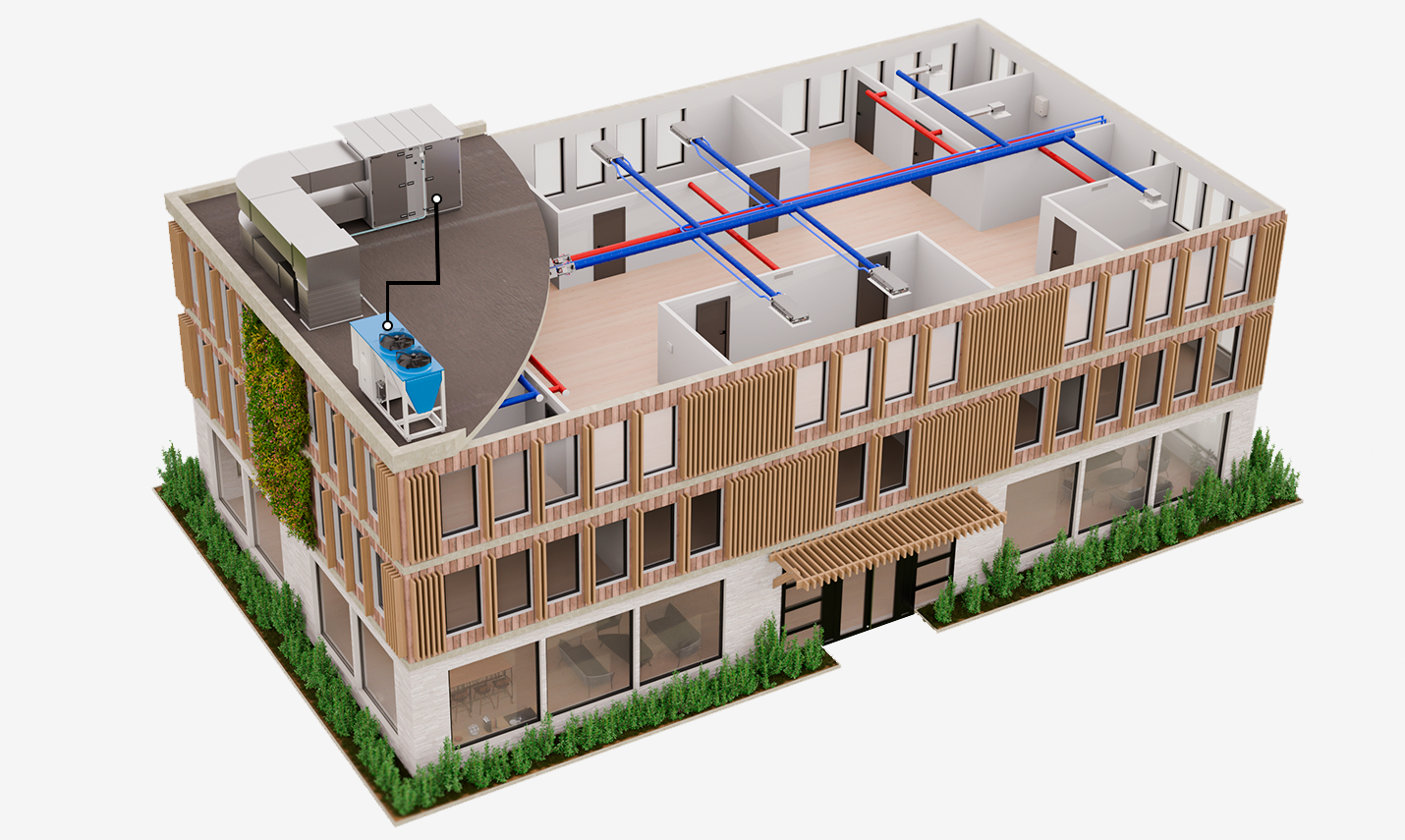 Complete system solution with ventilation, cooling, heating and energy optimisation.