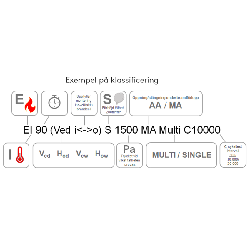 EyyxxS = krav på integritet och förhöjd brandgastäthet uppfyllda under angiven tid i minuter (xx) uppfyllt upp till angiven temperatur (yy)