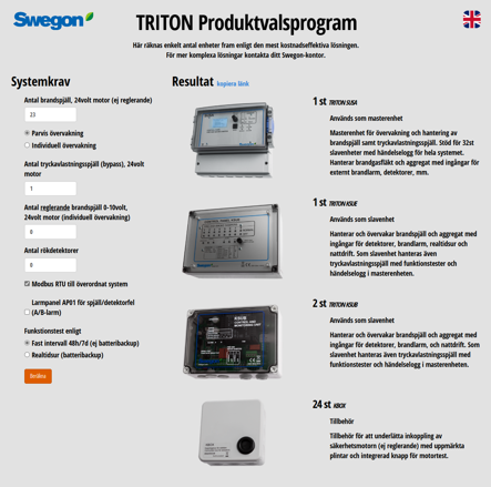TRITON Produktvalsprogram ger ett kostnadseffektivt produktförslag på antal enheter för styr och övervakning av 24 V AC motoriserade brand- och tryckavlastningsspjäll med fjäderåtergång. Produktförslaget kan exempelvis vara en fristående enhet eller ett antal enheter i nätverk, med en masterenhet och flera tillhörande slavenheter.